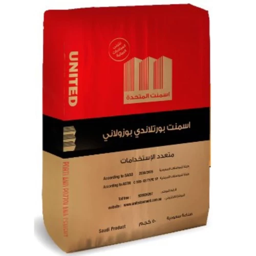 Pozzolanic Portland cement, United Brand, prevents alkaline reaction on blocks, reduces the permeability of cement for its high softness, is characterized by heat-insulating and increases cohesion properties, resistant to weather factors, fires and salts, used in block factories, concrete pipes exposed to water and sewage plants
