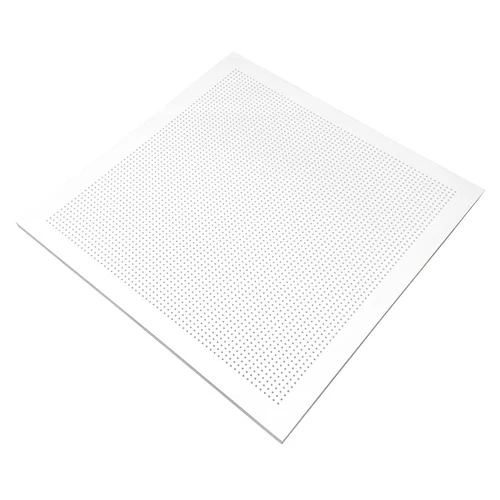 pvc coated perforated gypsum ceiling tile, fire resistant size 600x600 mm, thickness 12.5 mm, white color,It provides a unique aesthetic appeal due to its various perforation patterns, micro square design