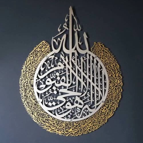 Islamic metal wall plate with a Quranic verse, size 59x46 cm, sillver with golden color, resistant to environmental factors and bacteria, with vibrant colors that last, offer a beautiful 3D effect that enhances the design's beauty and gives it a unique artistic depth