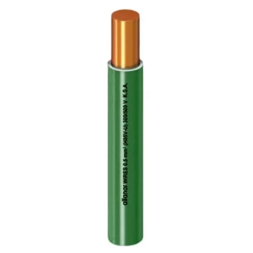 Solid copper electrical wire (CU/PVC), 4 mm2 cross-sectional area, 450/750 volts, phase core color green, manufactured by Alfanar, insulated with polyvinyl chloride (PVC), where the insulation layer protection for the wire against shocks, and abrasion, it also prevents harmful UV rays from damaging the cable.