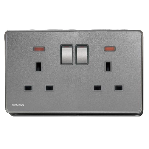 Switched socket with neon indicator 13A twin gang, dark gray color, size 86×146 mm, 250V, Siemens Brand (Delta Arina). Crafted from high-quality materials that withstand high temperatures, corrosion, and chemicals.