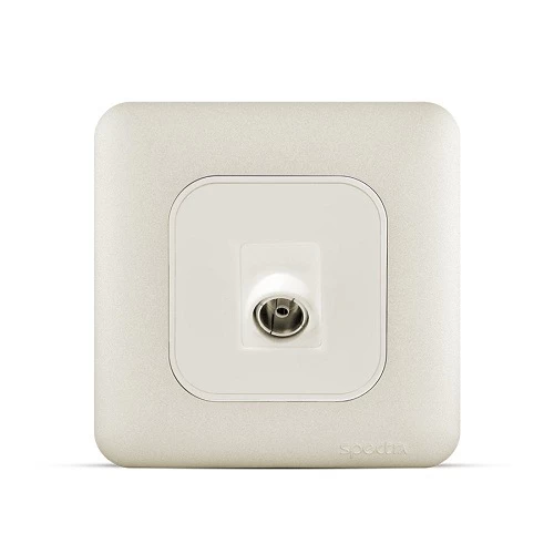 Angular TV socket 1 gang, manufactured by ACFA Modern (SPECTRA) according to Saudi and British standards. Designed to easily connect an antenna directly to a TV without the need for wall-mounted cables. Manufactured from innovative, high-quality materials that resist high heat and melting, also resistant to fire, breakage, corrosion, oils, and chemicals. The internal components are made of pure copper plated with silver to ensure maximum efficiency and electrical conductivity. Available in multiple designs and colors to suit diverse needs and applications, with a 25-year guarantee.