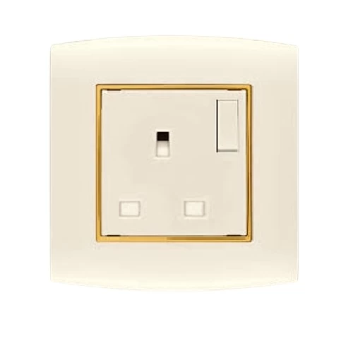 Electical switch socket with switch 2 way 13 AMP Omnia Size 7×7 cm Color beige with Gold Ring Brand AL-FANAR , they are equipped with a metallic frame for durability. They are Quality Mark-stamped and come with a product replacement warranty.