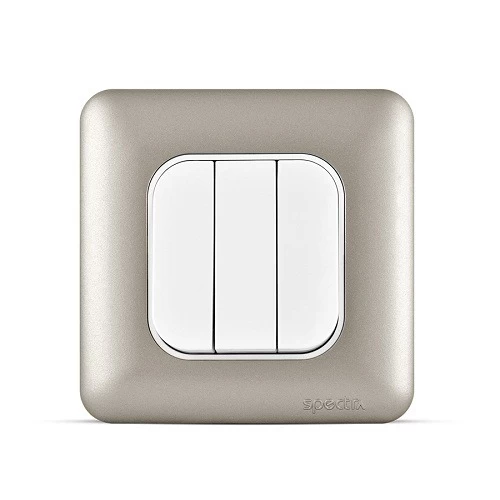 Electrical light switch 10Amp, 3 gang, titanium color, 7x7cm, 250V, SAS102, constructed from innovative, high-quality materials, resistant to fire and chemicals, manufactured by ACFA Modern (SPECTRA) Company according to Saudi and British standards.