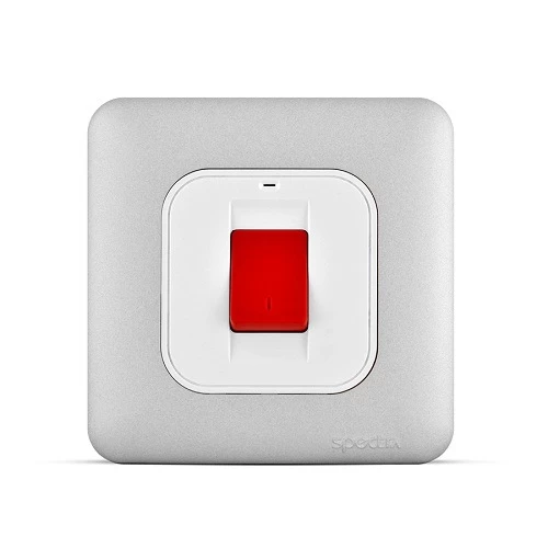 Air conditioner double pole switch with LED indicator, manufactured by ACFA Modern (SPECTRA) Company according to Saudi and British standards. Manufactured from innovative, high-quality materials that resist high heat, melting, and high current pressure, also resistant to fire, breakage, corrosion, oils, and chemicals. The internal components are made of pure copper plated with silver to ensure maximum efficiency and electrical conductivity. Available in multiple currents, designs, and colors to suit diverse needs and applications, with a 25-year guarantee.