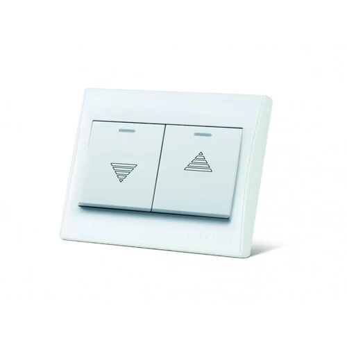 Double curtain switch 10 Amp Foutina, model 43409, size 7x7 cm, white color. provides smooth and independent control of two electric curtains. It features a sleek and modern design that complements various interior styles.