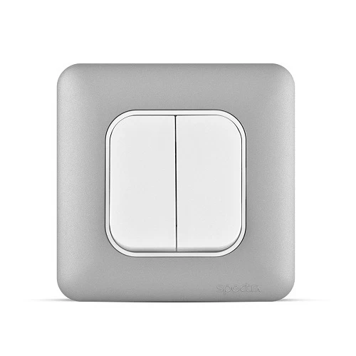 Electrical light switch 2 gang, 2 way, 10 amp, 250 volts, size 7x7 cm, light silver color, constructed from innovative, high-quality materials resistant to oils and chemicals, manufactured by ACFA Modern (SPECTRA) Company.