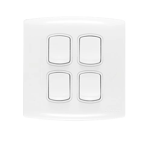 Electrical light switch 4 gang 2 way 10 AMP ALF Size 7×7 cm Color White Brand AL-FANAR , they are equipped with a metallic frame for durability. They are Quality Mark-stamped and come with a product replacement warranty.