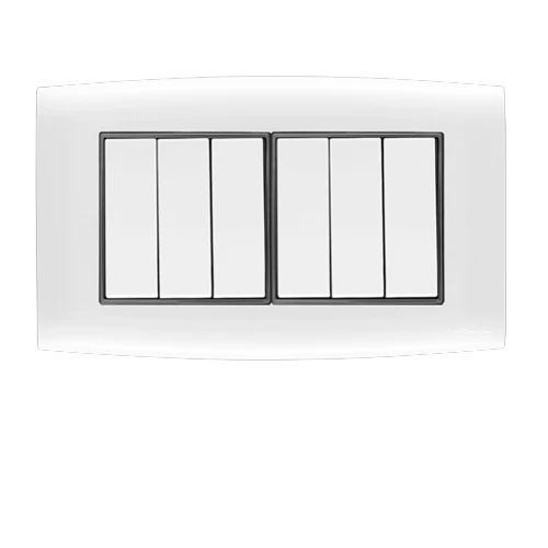 Electrical light switch 6 gang 10 AMP Omnia Size 7×14 cm Color White with Black Ring Brand AL-FANAR , they are equipped with a metallic frame for durability. They are Quality Mark-stamped and come with a product replacement warranty.