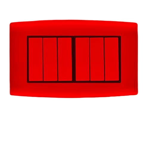Electrical light switch 6 gang 2 way 10 AMP omnia Size 7×14 cm Color Red with black ring Brand AL-FANAR , they are equipped with a metallic frame for durability. They are Quality Mark-stamped and come with a product replacement warranty.