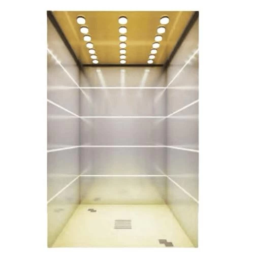 A machine roomless passenger elevator offering a blend of elegance and functionality in a compact design for limited spaces. It features a bronze mirror frame ceiling enhanced with acrylic lighting decoration. The walls are made of irregular-grain stainless steel inlaid with mirror strips, and the floor is finished in imitation marble parquet PVC. A luxurious design ideal for hotels and upscale residential buildings. Available in various styles.