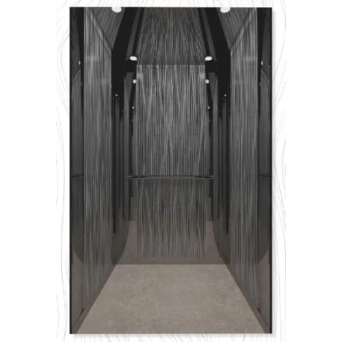 Machine room elevator designed with high-end materials, combining strong structure with a bold and luxurious dark aesthetic. The cabin features LED interior lighting for consistent illumination, and a black stainless steel ceiling for a premium, refined look. Both side and front panels are made from black stainless steel, enhanced with wood-textured decorative lines that add warmth and depth to the design. The floor is finished in glossy white crystal, offering a sleek contrast to the darker elements. Operated by a motor placed in a dedicated machine room, this elevator is engineered for stable and reliable performance. Available in various designs and load capacities to suit every requirement.