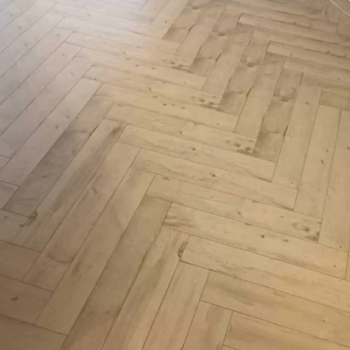 Wooden parquet flooring, herringbone pattern, grey color, 12mm thickness, model number 12850, water and moisture resistant, making It Ideal for Use in Areas with Temperature Fluctuations Such as kitchens and bathrooms.