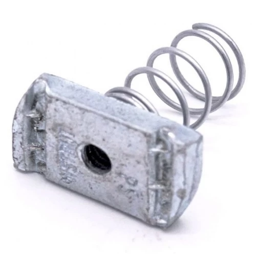 Hot dip galvanized long spring nut, from Aobsco company. Designed to securely assemble and hold items together without the need for additional tools or components. It is resistant to vibrations and movement, which prevents the nut from loosening or disintegrating over time. They are an ideal choice for applications that require frequent assembly and disassembly, making them easy to insert and remove with one hand. Suitable for a wide range of applications such as bolting into structural channels, providing the necessary fixation to internal or structural components.