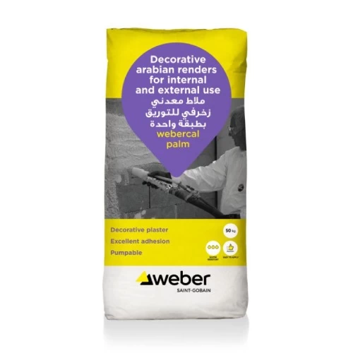 Decorative arabian render Webercal palm Paint, Brand SODAMCO-Weber, Suitable for interior and exterior use on walls, walls and concrete surfaces Designed to suit the look of traditional Arabic homes A special combination of quartz sand and graded fillers contribute to the unique workability properties while giving exceptional aesthetic appeal It also contains additives to improve water retention and adhesion, thus reducing Cracks occur.