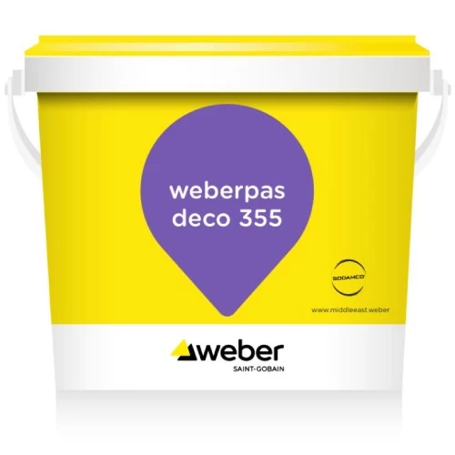 Decorative Weberpas deco 355 Waterproof Paint, Brand SODAMCO-Weber, Gallon Size 20 kg, Suitable for use on walls High-performance acrylic-based wet paint and glossy finish Made with acrylic dispersion for stability Includes a special combination of graded quartz sand and fillers that contribute to unique workability properties UV resistant High adhesion Unique aesthetic style, easy to apply, decorative finish.