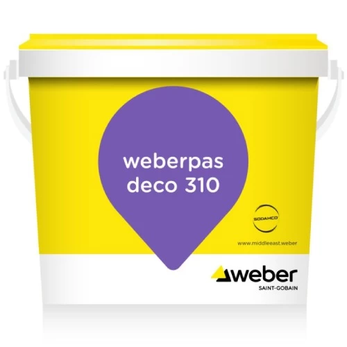 Cement Exterior Paint Weberpas deco 310, Brand SODAMCO-Weber, Suitable for use on walls, ribbed acrylic paint includes a special combination of graded quartz sand and fillers that contribute to unique workability properties. Special additives improve the product's resistance to water and UV rays. It is suitable for exterior and interior applications. It has high adhesion and a unique aesthetic style. Its kind, easy to apply, decorative finish.