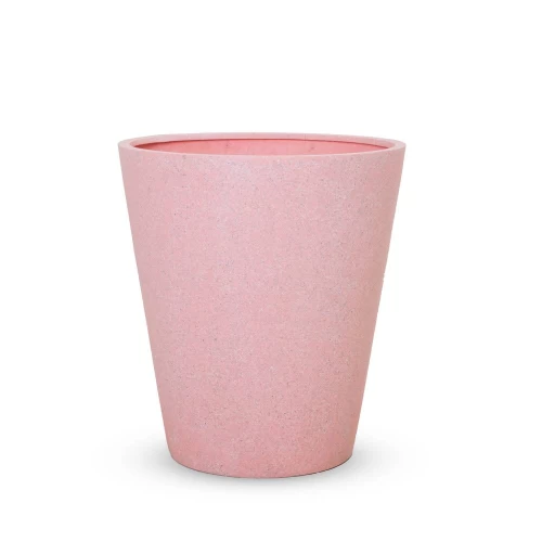 Cylindrical flower pot, 52 cm height and 45 cm width, pink color. Made of fiberglass, which is lightweight and durable, allowing for the planting of many plants inside. Available in various designs and shapes to suit different uses.