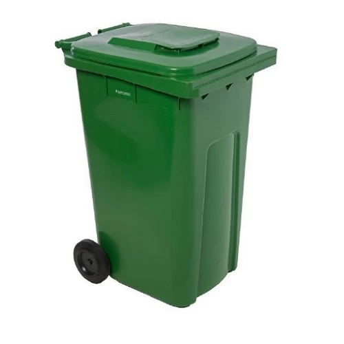 Plastic trash can, capacity 120 liters, green color, made from durable, break- and corrosion-resistant plastic materials, highly durable, ensuring long-term use, it features a practical design that makes emptying and cleaning easy