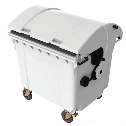 Get Plastic waste container with curved lid, Made of durable plastic materials that can withstand high temperatures and various weather conditions. White color, with capacity of 1100 liters, length 1.06 meters, width 1.37 meters, height 1.46 meters, It is equipped with a tightly closed lid that operates on hinges, in addition to a system for draining liquids.