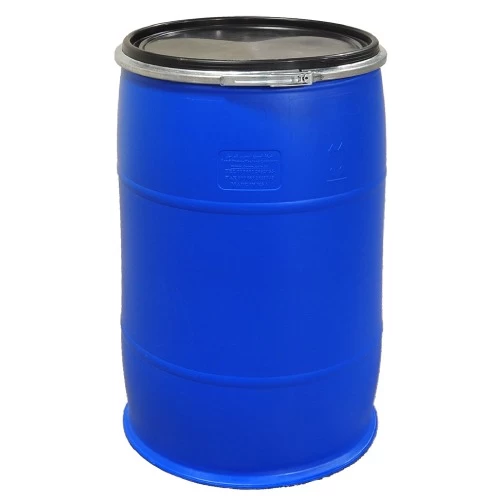 Plastic Open Top Drum, blue color, made of polyethylene, used for waste collection, and equipped with hand handles for easy loading and unloading, and conforming to standard specifications.