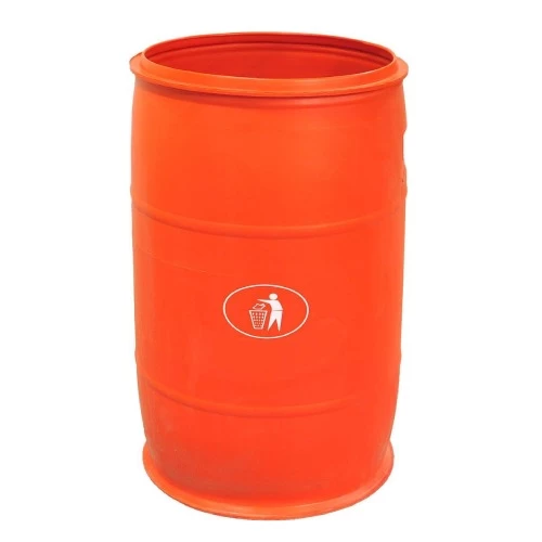 Plastic Open Top Drum, Red color, made of polyethylene, used for waste collection, and equipped with hand handles for easy loading and unloading, and conforming to standard specifications.