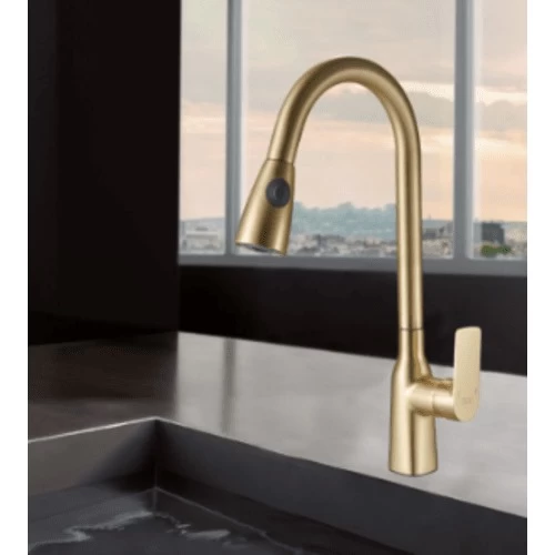 kitchen sink mixer, brand Pluto, matte gold color, made of high-quality, rust-resistant and durable materials, it features a practical and comfortable design, and a stylish and modern appearance that adds a touch of luxury, elegance and distinction to the kitchen sink.