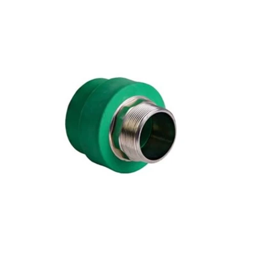 PPR coupling with male thread, size 3/4 inch× 25 mm, green colour. It is characterized by a long lifespan and high pressure tolerance. It is widely used in cold and hot water distribution systems, produced by Al Manar Factory.