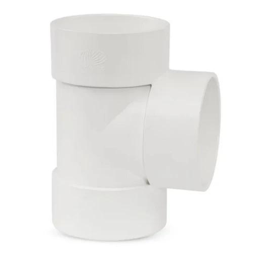 PVC plastic tee for three-way pipe connections, Produced by Almanar Pipes Factory (MANARCO). Used in residential plumbing and drain, waste, and vent (DWV) systems. It features good resistance to corrosion and chemicals, is lightweight and easy to handle during installation, in addition to a smooth inner surface which reduces friction, ensuring efficient fluid flow. Available in various sizes at the best price and quality.