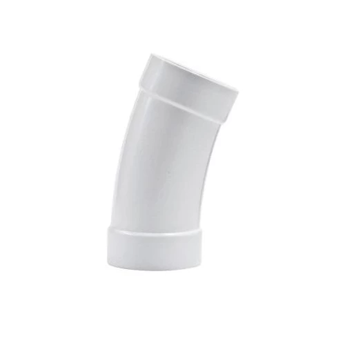 UPVC plastic elbow radius by Sappco factory, white in color. It is used to change the direction of the pipe at a 22.5° -degree angle. It is characterized by a long radius, which makes it smoother than a regular elbow. It reduces the pressure on the pipe and is characterized by good resistance to corrosion and chemicals. It is available in a variety of sizes with or without a socket on one end or on both ends.