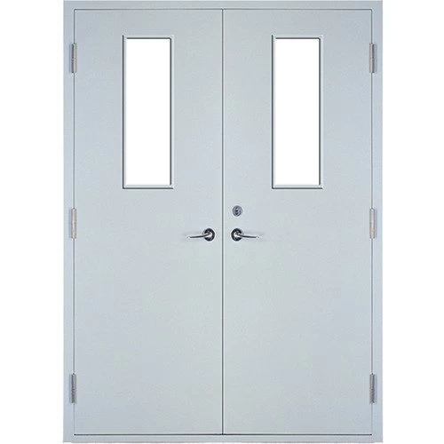 Fire door SFFECO galvanized steel with a rectangular glass window Model SF/DD Double Door leaf size 1950×1900 mm Color Gray