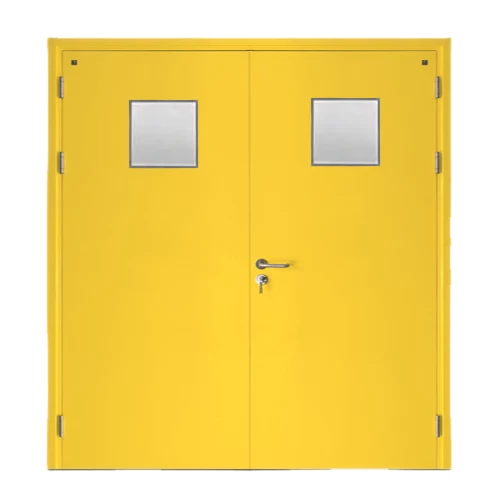 Fire door SFFECO galvanized steel with square glass window Model SF/DD Double Door leaf size 1950×1900 mm Color Yellow