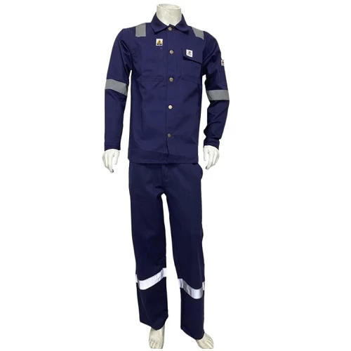 Fire-Resistant Workwear Suit, made from high-quality materials with an elastic waistband for a close and secure fit. It features additional tool pockets on the sleeves and lower side seams for extra storage space. The front pockets are equipped with flaps and snap buttons to ensure safe storage of tools. A 5 cm reflective tape is included to enhance visibility and safety in work environments requiring clear sight. Designed to provide exceptional flame protection, with excellent breathability ensuring comfort during long working hours. This suit offers both security and comfort for workers in construction sites that require frequent movement.