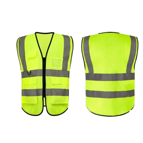 Reflective Safety Coat a stylish and high-quality reflective safety coat in yellow, made from polyester. It is equipped with four large pockets for carrying items such as keys, phones, and cards It comes with reflective strips to ensure clearer visibility in the dark and features a deep zipper closure that provides security and comfort while wearing.