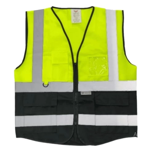 Reflective safety jacket made from high-visibility materials (black/yellow). It features a large Velcro strap, four pockets, and a deep zipper closure for added security and comfort while wearing. Additionally, wearing this jacket helps alert others and enhances safety. Available in size M.