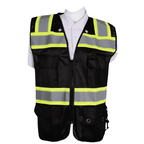 Durable, high-quality safety vest in black, with a phosphorescent stripe surrounding the front and back. Equipped with reflective tape, a durable zipper, and multiple pockets. Weighing 1kg with a durable 120g size (5XL), making it ideal for engineers, project managers, airports, factories, and institutes.