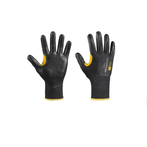 Cut-resistant gloves with ANSI/ISEA cut level, designed to provide effective protection with palm comfort. Featuring a nitrile coating for enhanced durability and flexibility, making them ideal for applications requiring cut protection. Size: 9 (Large).