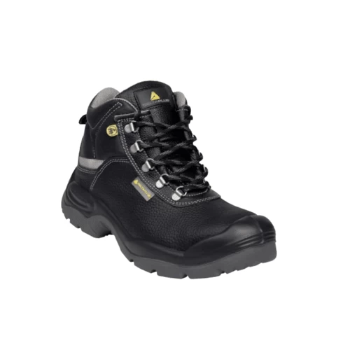 DeltaPlus Safety Shoes feature a modern and stylish design, equipped with a shock-absorbing heel to reduce joint pressure and a wide fit that accommodates broader foot shapes. They include a padded tongue to relieve lace pressure and a cushioned collar for additional comfort and ankle support. The shoes provide superior protection against electrostatic discharge, with a specially designed sole to ensure secure footing on stairs, as well as a stainless steel toe cap that is puncture-resistant.