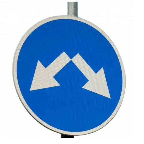 Circular guidance sign double arrow, characterized by high quality and resistance to various environmental conditions, helps in managing traffic flow on roads. It is used to clearly direct drivers regarding the available directions on the road. This sign displays two arrows to indicate that the road branches off into two directions, assisting drivers in making the right decision while driving.