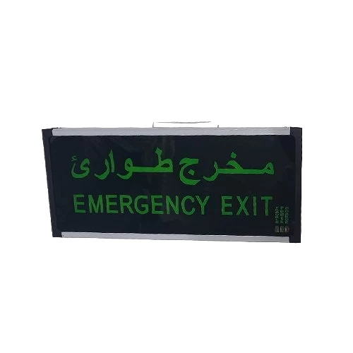 Emergency Exit Sign Board, is characterized by high quality and resistance to various environmental conditions. It features a practical and energy-efficient design with green LED lighting for clear visibility at all times, contains the word "Emergency Exit" written in both English and Arabic, ideal for use in public places such as commercial buildings, hospitals, schools, and more.