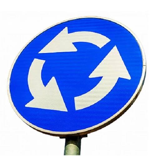 Roundabout Crossroad Road Traffic Sign, characterized by high quality and resistance to various environmental conditions, helps in managing traffic flow on roads, as it alerts drivers to the presence of an upcoming roundabout intersection, allowing them to take necessary precautions while driving.