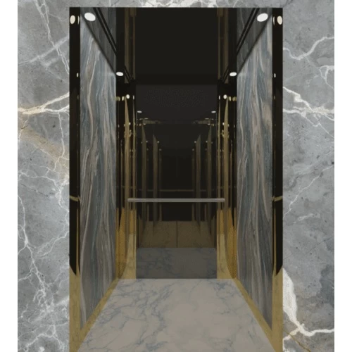 مصعد بنظام غرفة ماكينة يتميز بجودة عالية وتصميم فاخر يجمع بين الأداء القوي والمظهر الراقي. الكابينة مزودة بإنارة داخلية من نوع سبوت لايت لإضاءة متناسقة، وسقف من الزجاج الأسود يمنح انعكاسًا فخمًا وأنيقًا. الجدران الجانبية مصنوعة من بديل الرخام الفاخر، في حين أن الجهة الأمامية مغطاة بزجاج أسود مع تفاصيل من الاستانلس ستيل الذهبي، مما يضف على التصميم طابعًا عصريًا ومميزًا. الأرضية مصنوعة من رخام روزا الطبيعي، وتوفر مظهرًا متجانسًا مع باقي مكونات الكبينة. المصعد مزود بمحرك داخل غرفة مخصصة لتحقيق الاستقرار والأمان، ويتوفر بتصاميم مختلفة وسعات تحميل متعددة تناسب جميع الاحتياجات.