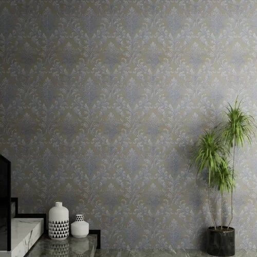 ورق جداري كلاسيك رمادي فاتح، مقاس 10م × 50 سم، الموديل 2032-GCT، يعطي انطباعاً بالفخامة والترف خاصة في المساحات الرسمية مثل غرف المعيشة أو المكاتب.