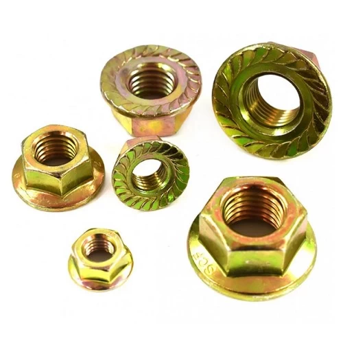 صامولة بورده مشرشرة مطلية بالزنك لون اصفر، من شركة أبسكو، تحتوي الصاموله السداسية على ورده مسننة مدمجة على جانب واحد تعمل على توزيع الحمل الموضوع على الصمولة على مساحة سطحية أوسع لمنع تلف مادة التثبيت. كما يخلق السطح المسنن تأثير قفل على المادة التي يتم تثبيتها. مما يجعل الصمولة أقل عرضة للارتخاء بمرور الوقت بسبب الاهتزازات.