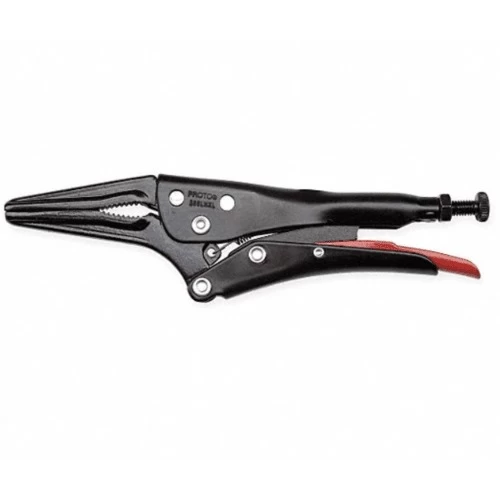 زرادية قفل فولاذية متينة، تتميز بآلية قفل حر اليدين لراحة المستخدم، ذراع تحرير سريع، فكوك مزورة وملف أسنان متين لضمان قوة التحمل والمتانة. الثقوب المحفورة في الفك المتحرك تضمن قبضة قوية للمسامير.