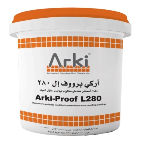 اركي برووف ال 280 من شركة اركي، دهان اسمنتي معالج بالبوليمر مكون من مركبين المركب الأول مستحلب أبيض من البوليمر والمركب الثاني مزيج من المكونات الاسمنتية والاضافات الجافة، يتميز قوة التصاق عالية حتى بعد الغمر بالمياه لفترات طويلة، ثبات ممتاز وسهولة في التطبيق، مرونة عالية لتغطية الشقوق الديناميكية في الأسطح، يستخدم في مجموعة متنوعة من التطبيقات مثل عزل المسابح، والحمامات، بالإضافة إلى استخدامه كغشاء عازل للهياكل المحتفظة بالماء مثل خزانات المياه، المجاري، والقنوات.