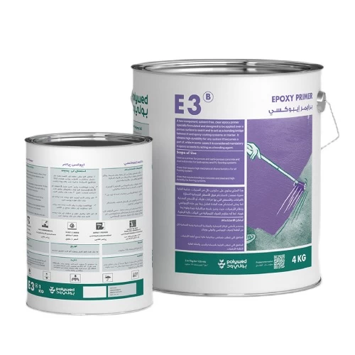برايمر ايبوكسي عازل للماء E3، براند بولى ود، للاستخدام فوق الأسطح الخرسانية و الأسطح المعدنية كما يمكن استخدامه كعامل ربط بين مادة الإيبوكسي ونظام الأرضيات حيث يتميز بقدرة ميكانيكية جيدة وقوة ربط قوية، يمتاز بمقاومته للمواد الكيميائية في البيئات عالية الرطوبة.