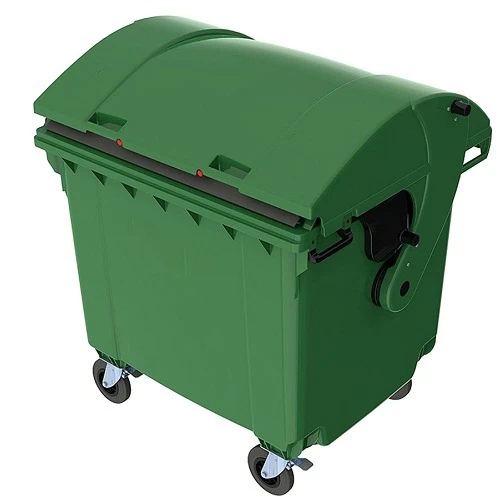 حاوية قمامة بلاستيك بغطاء منحني لون اخضر سعة 1100 لتر مقاس 1.37×1.06×1.46 متر