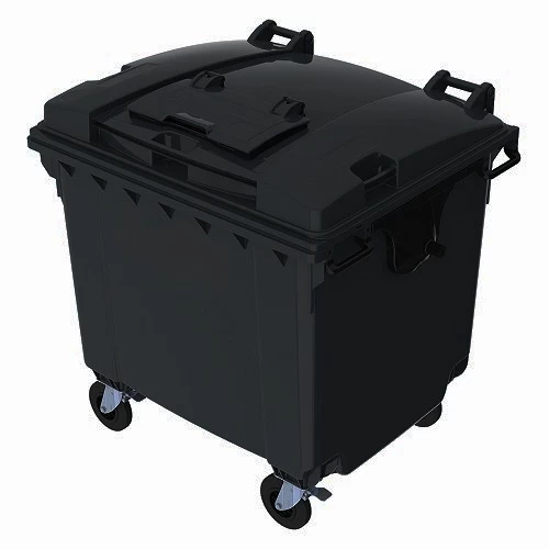 حاوية نفايات بلاستيك بغطاء مزدوج، لون اسود، بسعة 1100 لتر، طول 1.07 متر، عرض 1.37 متر، ارتفاع 1.33 متر
