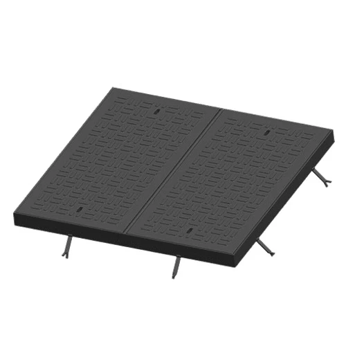 غطاء مانهول متعدد مستطيل الشكل والاطار، اطار من الفولاذ المطلي بمقاس 960×900 ملم، حمولة 40 طن، لون رمادي، انتاج مصنع سعودي كاست، مصنوع من الحديد الزهر الذي يتميز بانه مادة قوية ومتينة ومقاومة للتآكل.